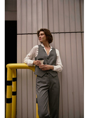 72,8 % POLYESTER 15,2 % METALICKÁ NIT 10 % VISKÓZA 2 % ELASTAN, PODŠÍVKA: 100 % POLYESTER. Tato šedá vesta s nadčasovým vzorem pepita přitahuje pozornost a umocňuje váš styl. Klasické knoflíky a praktické kapsy dodávají funkčnost, zatímco pečlivě vybraná polyesterová tkanina a podšívka zaručují celodenní pohodlí. Lehce přiléhavý střih decentně tvaruje postavu a zajišťuje elegantní vzhled jak pro každodenní výzvy, tak pro zvláštní příležitosti. Ideální pro každodenní nošení, práci nebo elegantnější schůzky. Perfektně se hodí ke klasickým kalhotám, pouzdrové sukni, ale i k džínům a jednoduchému topu a vytváří tak módní ležérní i business styl.