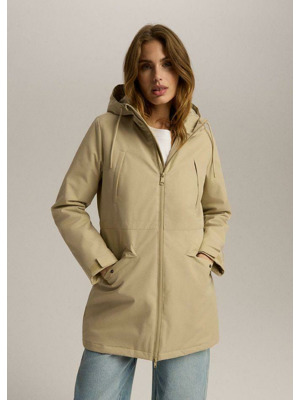 Minimalistická sportovní podzimní bunda s parkovým střihem – rovný, prodloužený střih, – vrchní materiál odolný vůči povětrnostním vlivům, – syntetická výplň a zateplení, – vysoký límec s integrovanou, nastavitelnou kapucí, – ozdobné lemování uvnitř podšívky, – hlavní zapínání na zip u kotníku, – 2 páry klop – boční a náprsní, – manžety se suchým zipem, – podšívka z log.